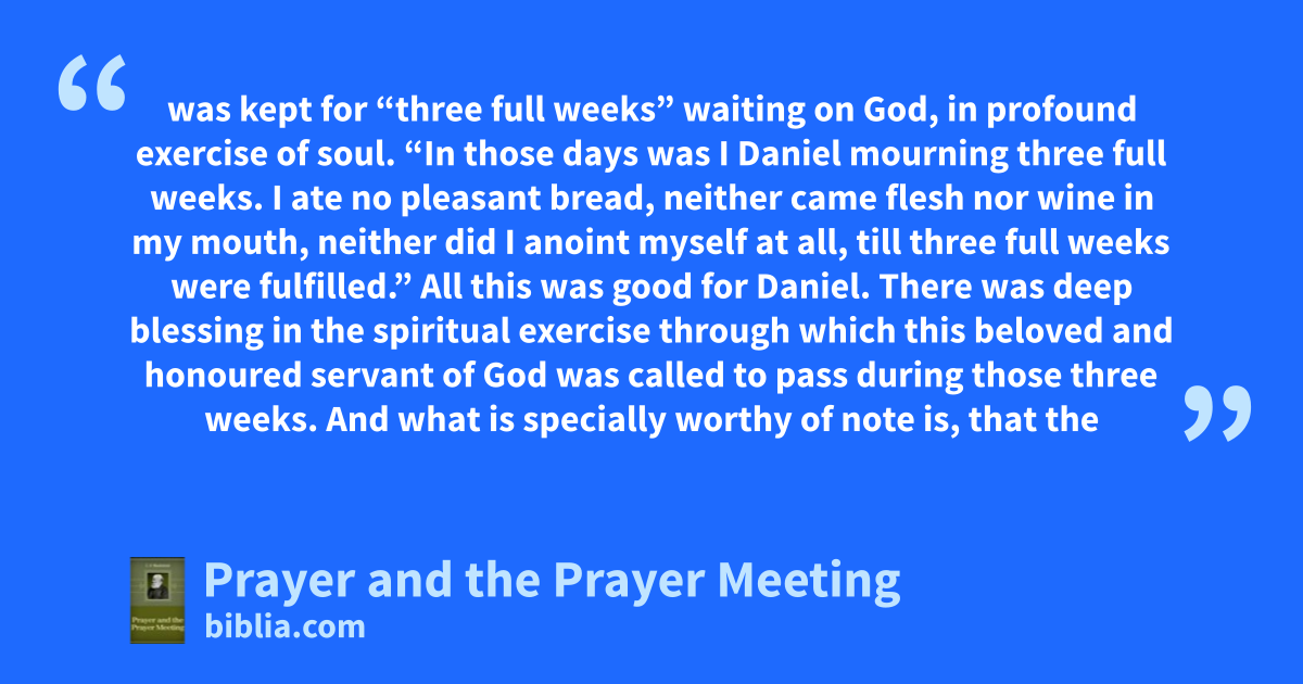 was kept for “three full weeks” waiting on God, in profound exercise of soul. “In those days was I Daniel mourning three full weeks. I ate no pleasant bread, neither came flesh nor wine in my mouth, neither did I anoint myself at all, till three full weeks were fulfilled.” All this was good for Daniel. There was deep blessing in the spiritual exercise through which this beloved and honoured servant of God was called to pass during those three weeks. And what is specially worthy of note is, that the