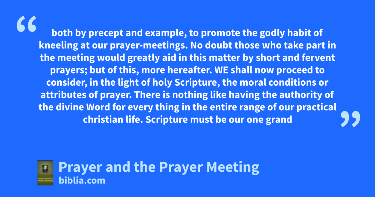 both by precept and example, to promote the godly habit of kneeling at our prayer-meetings. No doubt those who take part in the meeting would greatly aid in this matter by short and fervent prayers; but of this, more hereafter. WE shall now proceed to consider, in the light of holy Scripture, the moral conditions or attributes of prayer. There is nothing like having the authority of the divine Word for every thing in the entire range of our practical christian life. Scripture must be our one grand