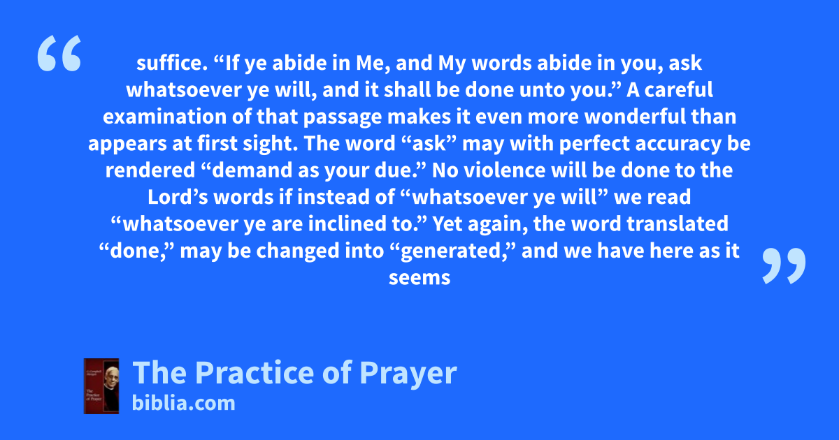 suffice. “If ye abide in Me, and My words abide in you, ask whatsoever ye will, and it shall be done unto you.” A careful examination of that passage makes it even more wonderful than appears at first sight. The word “ask” may with perfect accuracy be rendered “demand as your due.” No violence will be done to the Lord’s words if instead of “whatsoever ye will” we read “whatsoever ye are inclined to.” Yet again, the word translated “done,” may be changed into “generated,” and we have here as it seems