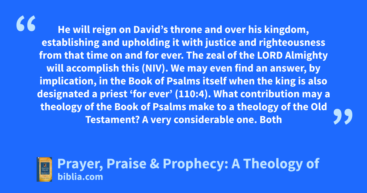 He will reign on David’s throne and over his kingdom, establishing and upholding it with justice and righteousness from that time on and for ever. The zeal of the LORD Almighty will accomplish this (NIV). We may even find an answer, by implication, in the Book of Psalms itself when the king is also designated a priest ‘for ever’ (110:4). What contribution may a theology of the Book of Psalms make to a theology of the Old Testament? A very considerable one. Both
