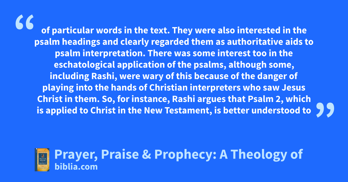 of particular words in the text. They were also interested in the psalm headings and clearly regarded them as authoritative aids to psalm interpretation. There was some interest too in the eschatological application of the psalms, although some, including Rashi, were wary of this because of the danger of playing into the hands of Christian interpreters who saw Jesus Christ in them. So, for instance, Rashi argues that Psalm 2, which is applied to Christ in the New Testament, is better understood to