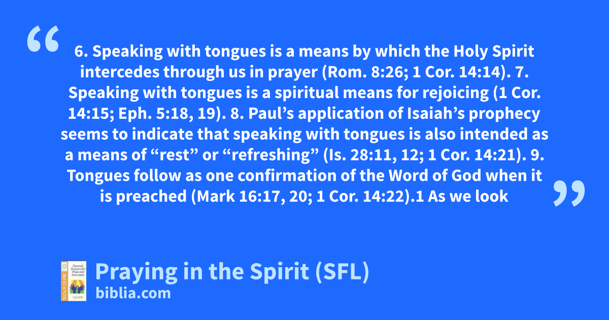 6. Speaking with tongues is a means by which the Holy Spirit intercedes through us in prayer (Rom. 8:26; 1 Cor. 14:14). 7. Speaking with tongues is a spiritual means for rejoicing (1 Cor. 14:15; Eph. 5:18, 19). 8. Paul’s application of Isaiah’s prophecy seems to indicate that speaking with tongues is also intended as a means of “rest” or “refreshing” (Is. 28:11, 12; 1 Cor. 14:21). 9. Tongues follow as one confirmation of the Word of God when it is preached (Mark 16:17, 20; 1 Cor. 14:22).1 As we look