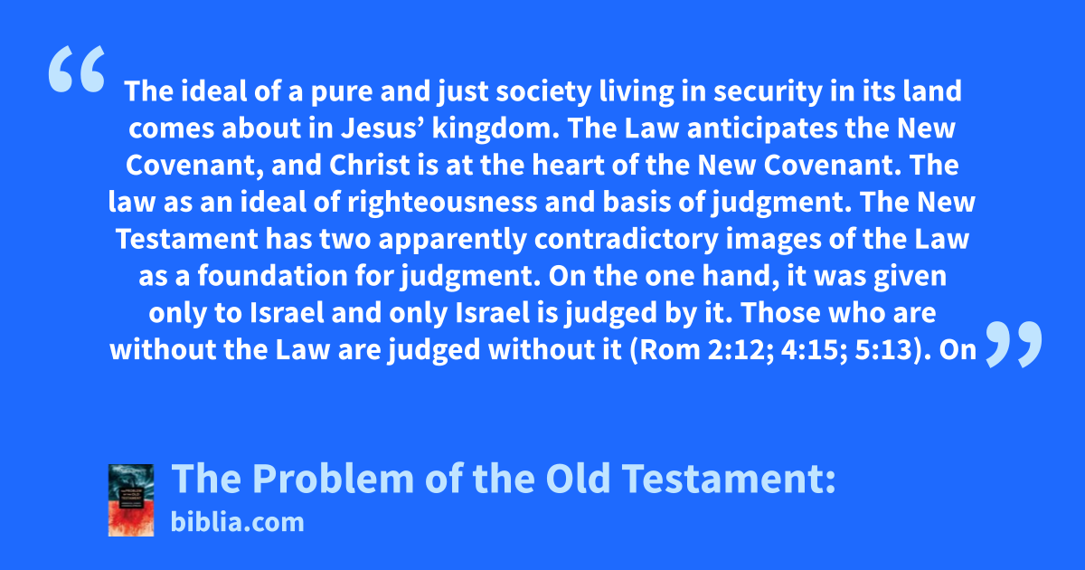 The ideal of a pure and just society living in security in its land comes about in Jesus’ kingdom. The Law anticipates the New Covenant, and Christ is at the heart of the New Covenant. The law as an ideal of righteousness and basis of judgment. The New Testament has two apparently contradictory images of the Law as a foundation for judgment. On the one hand, it was given only to Israel and only Israel is judged by it. Those who are without the Law are judged without it (Rom 2:12; 4:15; 5:13). On