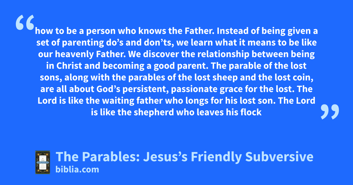 how to be a person who knows the Father. Instead of being given a set of parenting do’s and don’ts, we learn what it means to be like our heavenly Father. We discover the relationship between being in Christ and becoming a good parent. The parable of the lost sons, along with the parables of the lost sheep and the lost coin, are all about God’s persistent, passionate grace for the lost. The Lord is like the waiting father who longs for his lost son. The Lord is like the shepherd who leaves his flock