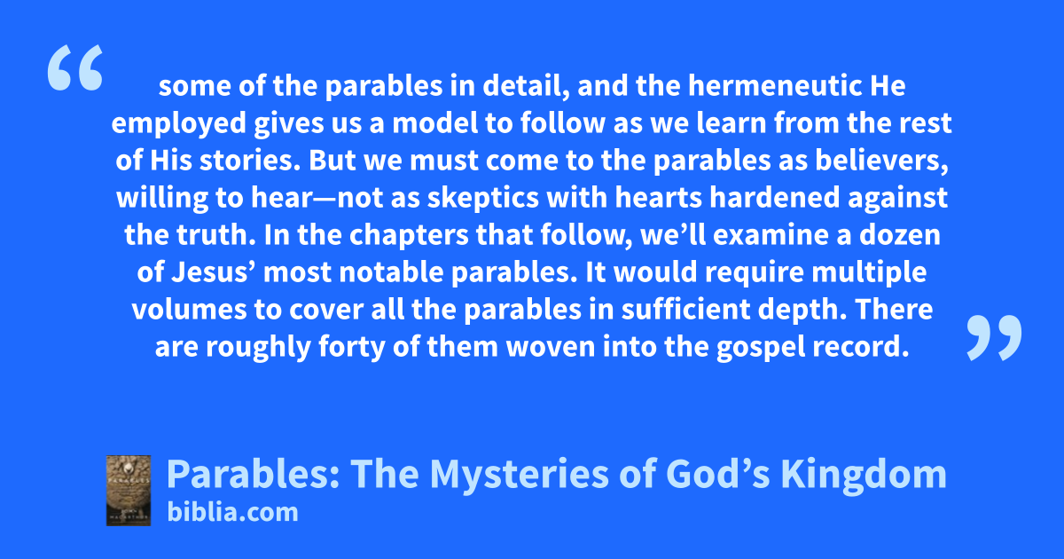 some of the parables in detail, and the hermeneutic He employed gives us a model to follow as we learn from the rest of His stories. But we must come to the parables as believers, willing to hear—not as skeptics with hearts hardened against the truth. In the chapters that follow, we’ll examine a dozen of Jesus’ most notable parables. It would require multiple volumes to cover all the parables in sufficient depth. There are roughly forty of them woven into the gospel record.