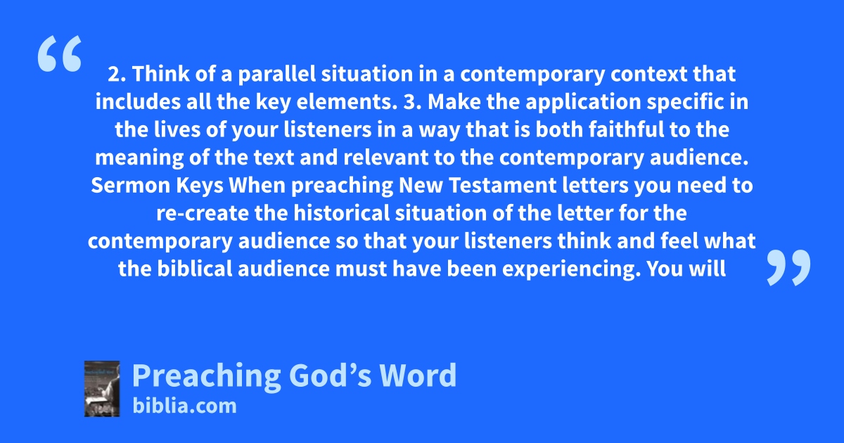 2. Think of a parallel situation in a contemporary context that includes all the key elements. 3. Make the application specific in the lives of your listeners in a way that is both faithful to the meaning of the text and relevant to the contemporary audience. Sermon Keys When preaching New Testament letters you need to re-create the historical situation of the letter for the contemporary audience so that your listeners think and feel what the biblical audience must have been experiencing. You will