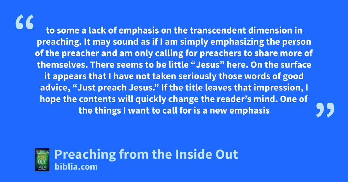 to some a lack of emphasis on the transcendent dimension in preaching. It may sound as if I am simply emphasizing the person of the preacher and am only calling for preachers to share more of themselves. There seems to be little “Jesus” here. On the surface it appears that I have not taken seriously those words of good advice, “Just preach Jesus.” If the title leaves that impression, I hope the contents will quickly change the reader’s mind. One of the things I want to call for is a new emphasis