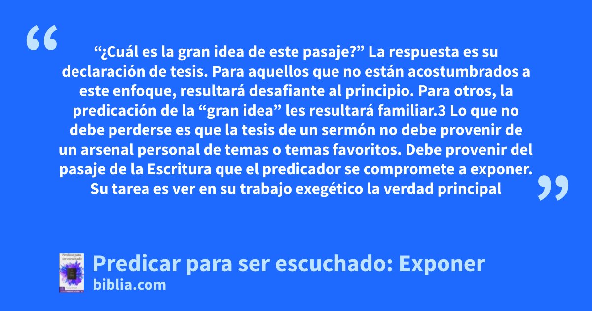 “¿Cuál es la gran idea de este pasaje?” La respuesta es su declaración de tesis. Para aquellos que no están acostumbrados a este enfoque, resultará desafiante al principio. Para otros, la predicación de la “gran idea” les resultará familiar.3 Lo que no debe perderse es que la tesis de un sermón no debe provenir de un arsenal personal de temas o temas favoritos. Debe provenir del pasaje de la Escritura que el predicador se compromete a exponer. Su tarea es ver en su trabajo exegético la verdad principal