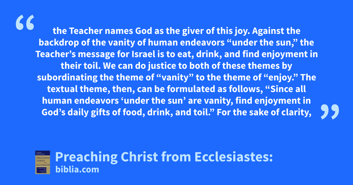 the Teacher names God as the giver of this joy. Against the backdrop of the vanity of human endeavors “under the sun,” the Teacher’s message for Israel is to eat, drink, and find enjoyment in their toil. We can do justice to both of these themes by subordinating the theme of “vanity” to the theme of “enjoy.” The textual theme, then, can be formulated as follows, “Since all human endeavors ‘under the sun’ are vanity, find enjoyment in God’s daily gifts of food, drink, and toil.” For the sake of clarity,