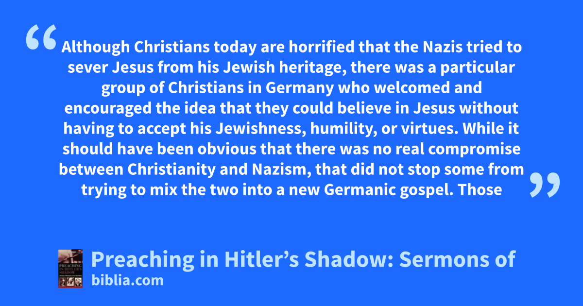 Although Christians today are horrified that the Nazis tried to sever Jesus from his Jewish heritage, there was a particular group of Christians in Germany who welcomed and encouraged the idea that they could believe in Jesus without having to accept his Jewishness, humility, or virtues. While it should have been obvious that there was no real compromise between Christianity and Nazism, that did not stop some from trying to mix the two into a new Germanic gospel. Those