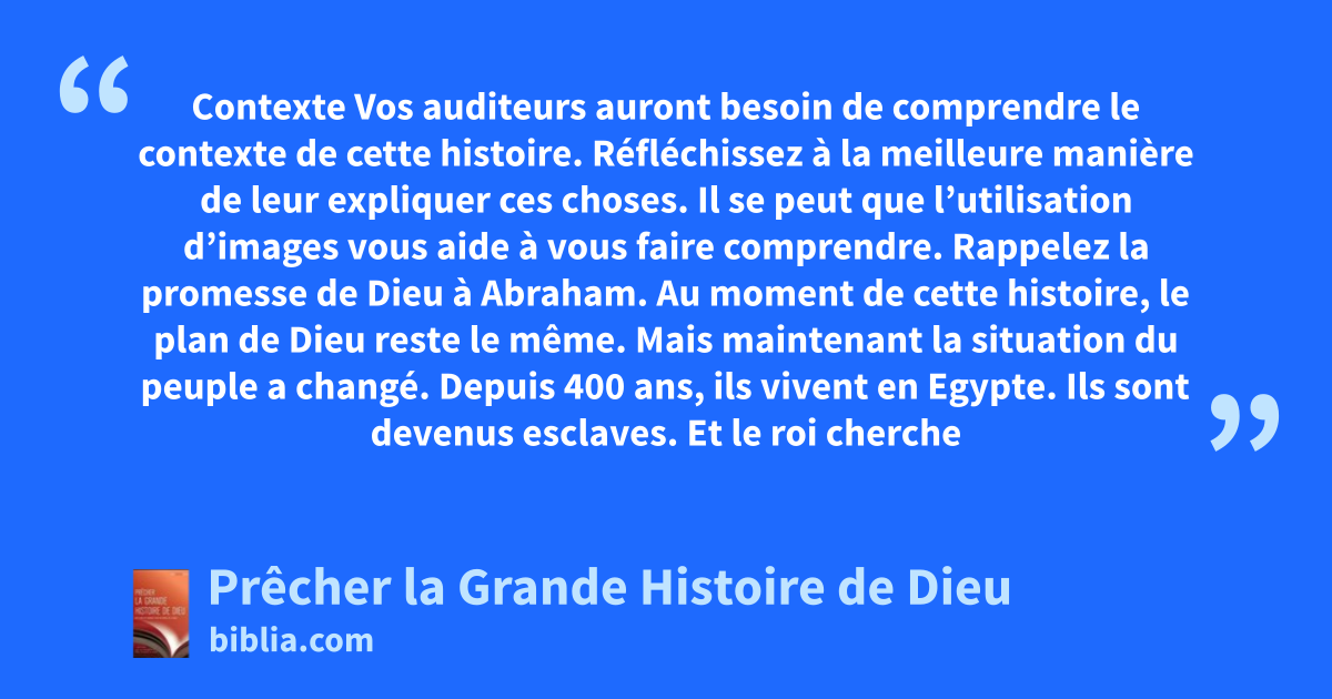 Contexte Vos auditeurs auront besoin de comprendre le contexte de cette histoire. Réfléchissez à la meilleure manière de leur expliquer ces choses. Il se peut que l’utilisation d’images vous aide à vous faire comprendre. Rappelez la promesse de Dieu à Abraham. Au moment de cette histoire, le plan de Dieu reste le même. Mais maintenant la situation du peuple a changé. Depuis 400 ans, ils vivent en Egypte. Ils sont devenus esclaves. Et le roi cherche