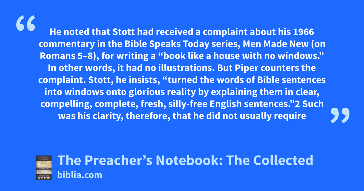 He noted that Stott had received a complaint about his 1966 commentary in the Bible Speaks Today series, Men Made New (on Romans 5–8), for writing a “book like a house with no windows.” In other words, it had no illustrations. But Piper counters the complaint. Stott, he insists, “turned the words of Bible sentences into windows onto glorious reality by explaining them in clear, compelling, complete, fresh, silly-free English sentences.”2 Such was his clarity, therefore, that he did not usually require