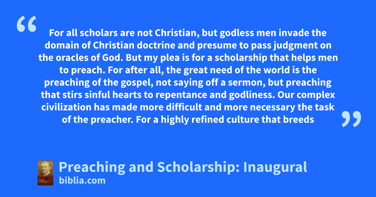 For all scholars are not Christian, but godless men invade the domain of Christian doctrine and presume to pass judgment on the oracles of God. But my plea is for a scholarship that helps men to preach. For after all, the great need of the world is the preaching of the gospel, not saying off a sermon, but preaching that stirs sinful hearts to repentance and godliness. Our complex civilization has made more difficult and more necessary the task of the preacher. For a highly refined culture that breeds