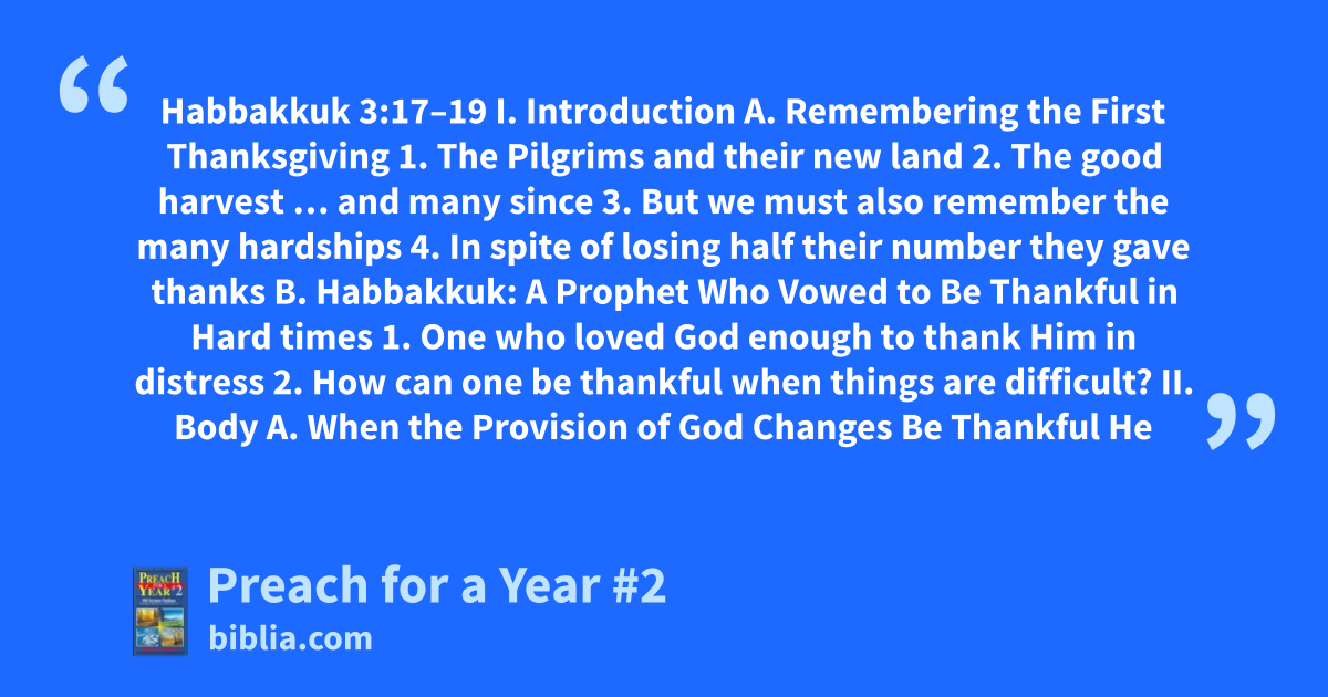 Habbakkuk 3:17–19 I. Introduction A. Remembering the First Thanksgiving 1. The Pilgrims and their new land 2. The good harvest … and many since 3. But we must also remember the many hardships 4. In spite of losing half their number they gave thanks B. Habbakkuk: A Prophet Who Vowed to Be Thankful in Hard times 1. One who loved God enough to thank Him in distress 2. How can one be thankful when things are difficult? II. Body A. When the Provision of God Changes Be Thankful He
