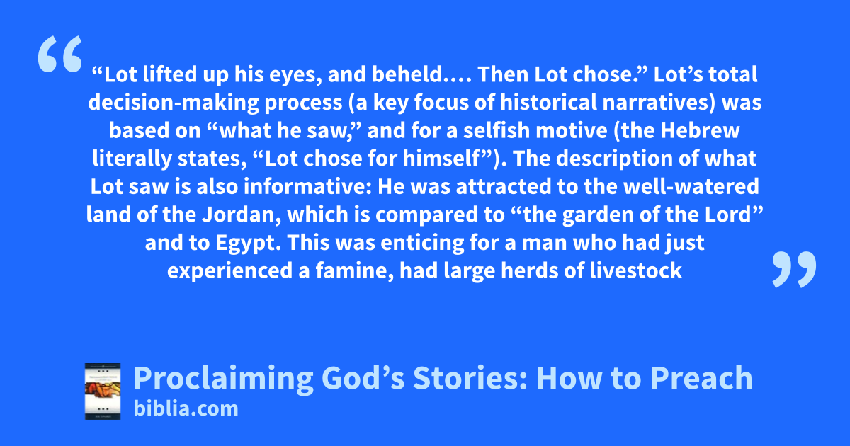 “Lot lifted up his eyes, and beheld.… Then Lot chose.” Lot’s total decision-making process (a key focus of historical narratives) was based on “what he saw,” and for a selfish motive (the Hebrew literally states, “Lot chose for himself”). The description of what Lot saw is also informative: He was attracted to the well-watered land of the Jordan, which is compared to “the garden of the Lord” and to Egypt. This was enticing for a man who had just experienced a famine, had large herds of livestock