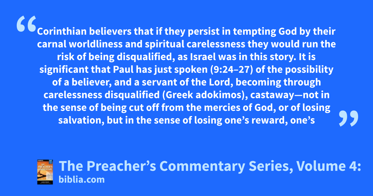 Corinthian believers that if they persist in tempting God by their carnal worldliness and spiritual carelessness they would run the risk of being disqualified, as Israel was in this story. It is significant that Paul has just spoken (9:24–27) of the possibility of a believer, and a servant of the Lord, becoming through carelessness disqualified (Greek adokimos), castaway—not in the sense of being cut off from the mercies of God, or of losing salvation, but in the sense of losing one’s reward, one’s