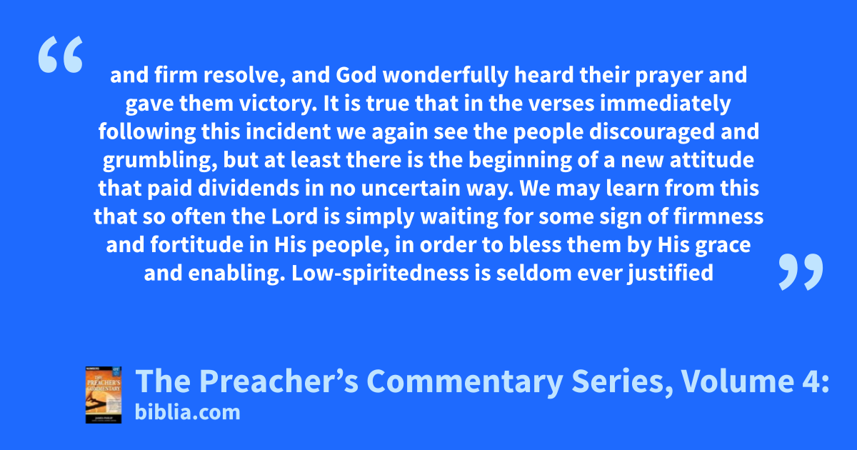 and firm resolve, and God wonderfully heard their prayer and gave them victory. It is true that in the verses immediately following this incident we again see the people discouraged and grumbling, but at least there is the beginning of a new attitude that paid dividends in no uncertain way. We may learn from this that so often the Lord is simply waiting for some sign of firmness and fortitude in His people, in order to bless them by His grace and enabling. Low-spiritedness is seldom ever justified