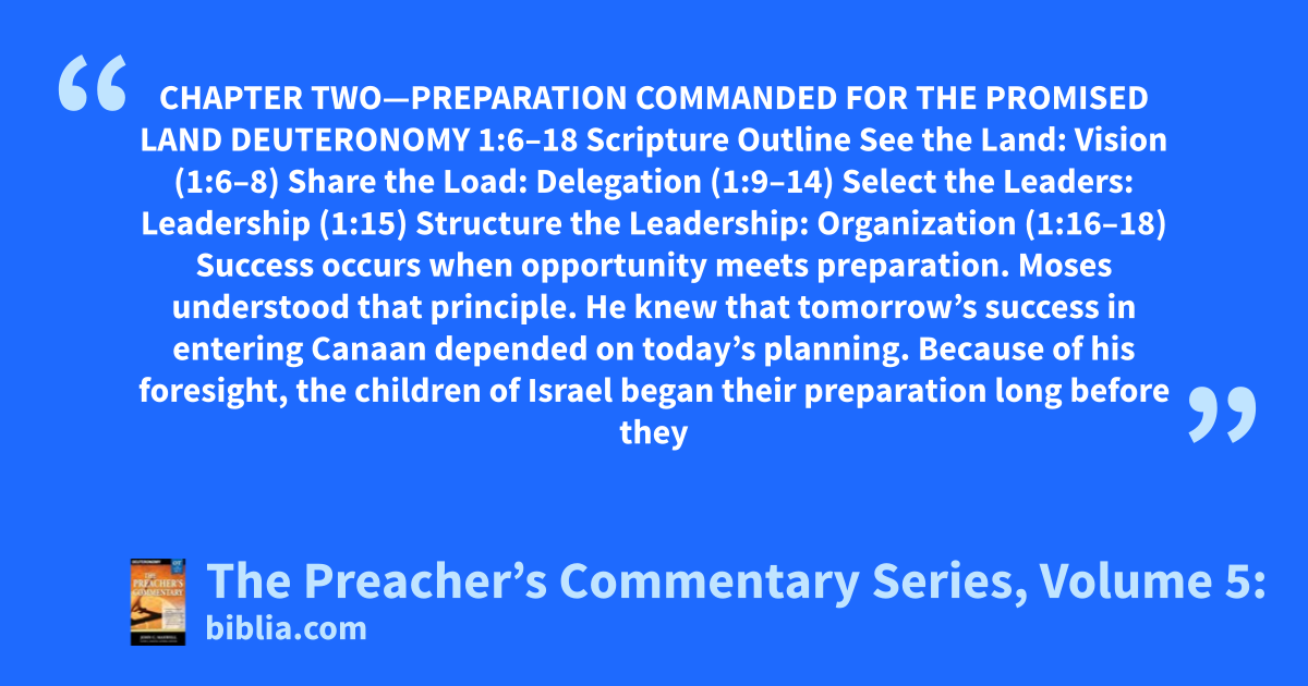 CHAPTER TWO—PREPARATION COMMANDED FOR THE PROMISED LAND DEUTERONOMY 1:6–18 Scripture Outline See the Land: Vision (1:6–8) Share the Load: Delegation (1:9–14) Select the Leaders: Leadership (1:15) Structure the Leadership: Organization (1:16–18) Success occurs when opportunity meets preparation. Moses understood that principle. He knew that tomorrow’s success in entering Canaan depended on today’s planning. Because of his foresight, the children of Israel began their preparation long before they