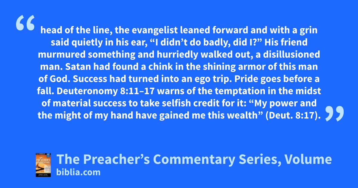 head of the line, the evangelist leaned forward and with a grin said quietly in his ear, “I didn’t do badly, did I?” His friend murmured something and hurriedly walked out, a disillusioned man. Satan had found a chink in the shining armor of this man of God. Success had turned into an ego trip. Pride goes before a fall. Deuteronomy 8:11–17 warns of the temptation in the midst of material success to take selfish credit for it: “My power and the might of my hand have gained me this wealth” (Deut. 8:17).