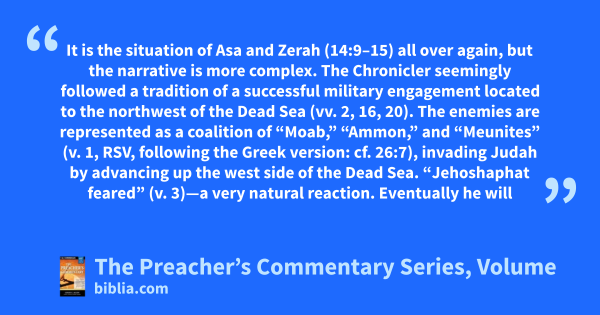 It is the situation of Asa and Zerah (14:9–15) all over again, but the narrative is more complex. The Chronicler seemingly followed a tradition of a successful military engagement located to the northwest of the Dead Sea (vv. 2, 16, 20). The enemies are represented as a coalition of “Moab,” “Ammon,” and “Meunites” (v. 1, RSV, following the Greek version: cf. 26:7), invading Judah by advancing up the west side of the Dead Sea. “Jehoshaphat feared” (v. 3)—a very natural reaction. Eventually he will