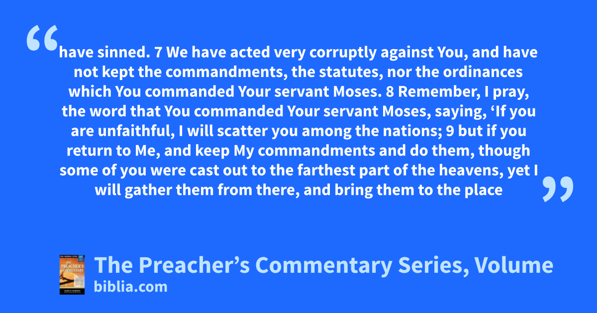have sinned. 7 We have acted very corruptly against You, and have not kept the commandments, the statutes, nor the ordinances which You commanded Your servant Moses. 8 Remember, I pray, the word that You commanded Your servant Moses, saying, ‘If you are unfaithful, I will scatter you among the nations; 9 but if you return to Me, and keep My commandments and do them, though some of you were cast out to the farthest part of the heavens, yet I will gather them from there, and bring them to the place
