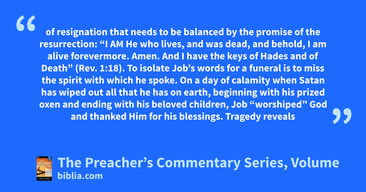 of resignation that needs to be balanced by the promise of the resurrection: “I AM He who lives, and was dead, and behold, I am alive forevermore. Amen. And I have the keys of Hades and of Death” (Rev. 1:18). To isolate Job’s words for a funeral is to miss the spirit with which he spoke. On a day of calamity when Satan has wiped out all that he has on earth, beginning with his prized oxen and ending with his beloved children, Job “worshiped” God and thanked Him for his blessings. Tragedy reveals