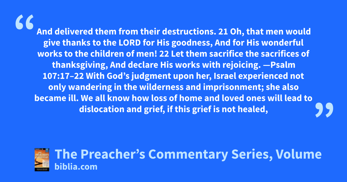 And delivered them from their destructions. 21 Oh, that men would give thanks to the LORD for His goodness, And for His wonderful works to the children of men! 22 Let them sacrifice the sacrifices of thanksgiving, And declare His works with rejoicing. —Psalm 107:17–22 With God’s judgment upon her, Israel experienced not only wandering in the wilderness and imprisonment; she also became ill. We all know how loss of home and loved ones will lead to dislocation and grief, if this grief is not healed,
