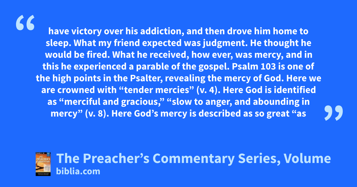 have victory over his addiction, and then drove him home to sleep. What my friend expected was judgment. He thought he would be fired. What he received, how ever, was mercy, and in this he experienced a parable of the gospel. Psalm 103 is one of the high points in the Psalter, revealing the mercy of God. Here we are crowned with “tender mercies” (v. 4). Here God is identified as “merciful and gracious,” “slow to anger, and abounding in mercy” (v. 8). Here God’s mercy is described as so great “as