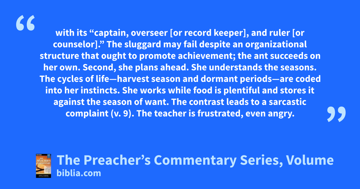 with its “captain, overseer [or record keeper], and ruler [or counselor].” The sluggard may fail despite an organizational structure that ought to promote achievement; the ant succeeds on her own. Second, she plans ahead. She understands the seasons. The cycles of life—harvest season and dormant periods—are coded into her instincts. She works while food is plentiful and stores it against the season of want. The contrast leads to a sarcastic complaint (v. 9). The teacher is frustrated, even angry.