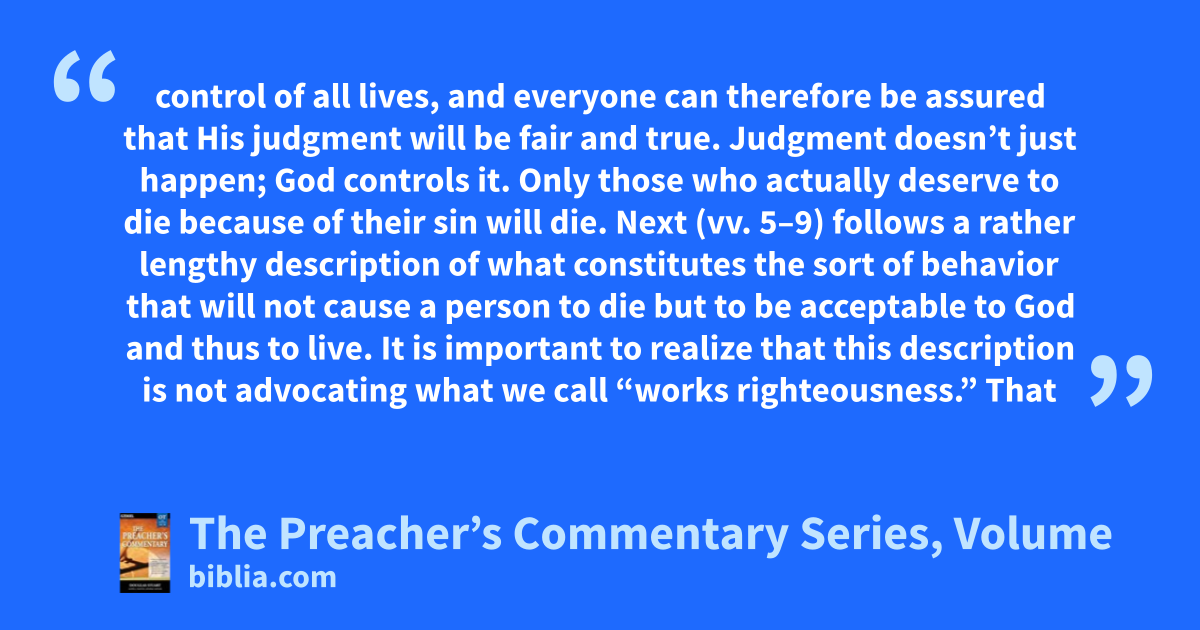 control of all lives, and everyone can therefore be assured that His judgment will be fair and true. Judgment doesn’t just happen; God controls it. Only those who actually deserve to die because of their sin will die. Next (vv. 5–9) follows a rather lengthy description of what constitutes the sort of behavior that will not cause a person to die but to be acceptable to God and thus to live. It is important to realize that this description is not advocating what we call “works righteousness.” That
