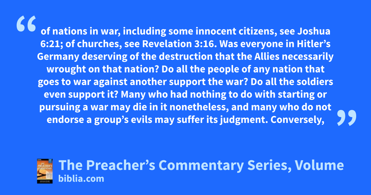 of nations in war, including some innocent citizens, see Joshua 6:21; of churches, see Revelation 3:16. Was everyone in Hitler’s Germany deserving of the destruction that the Allies necessarily wrought on that nation? Do all the people of any nation that goes to war against another support the war? Do all the soldiers even support it? Many who had nothing to do with starting or pursuing a war may die in it nonetheless, and many who do not endorse a group’s evils may suffer its judgment. Conversely,