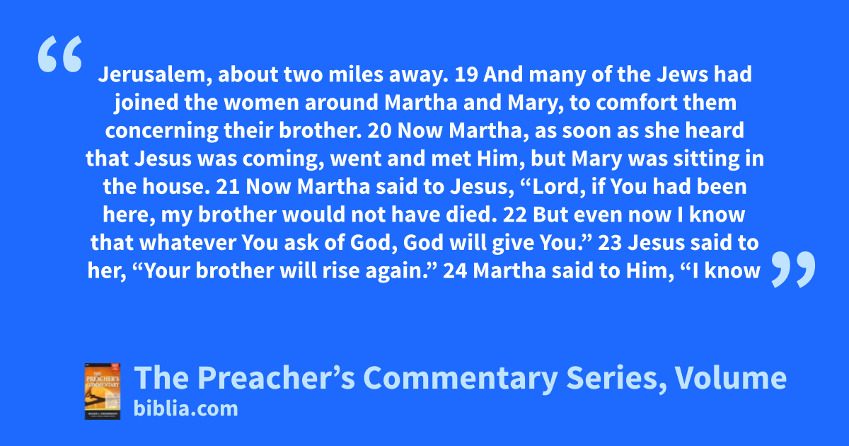Jerusalem, about two miles away. 19 And many of the Jews had joined the women around Martha and Mary, to comfort them concerning their brother. 20 Now Martha, as soon as she heard that Jesus was coming, went and met Him, but Mary was sitting in the house. 21 Now Martha said to Jesus, “Lord, if You had been here, my brother would not have died. 22 But even now I know that whatever You ask of God, God will give You.” 23 Jesus said to her, “Your brother will rise again.” 24 Martha said to Him, “I know