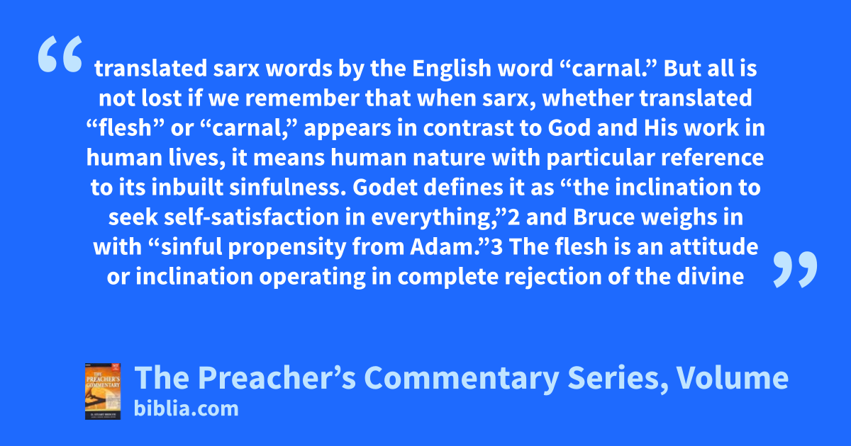 translated sarx words by the English word “carnal.” But all is not lost if we remember that when sarx, whether translated “flesh” or “carnal,” appears in contrast to God and His work in human lives, it means human nature with particular reference to its inbuilt sinfulness. Godet defines it as “the inclination to seek self-satisfaction in everything,”2 and Bruce weighs in with “sinful propensity from Adam.”3 The flesh is an attitude or inclination operating in complete rejection of the divine