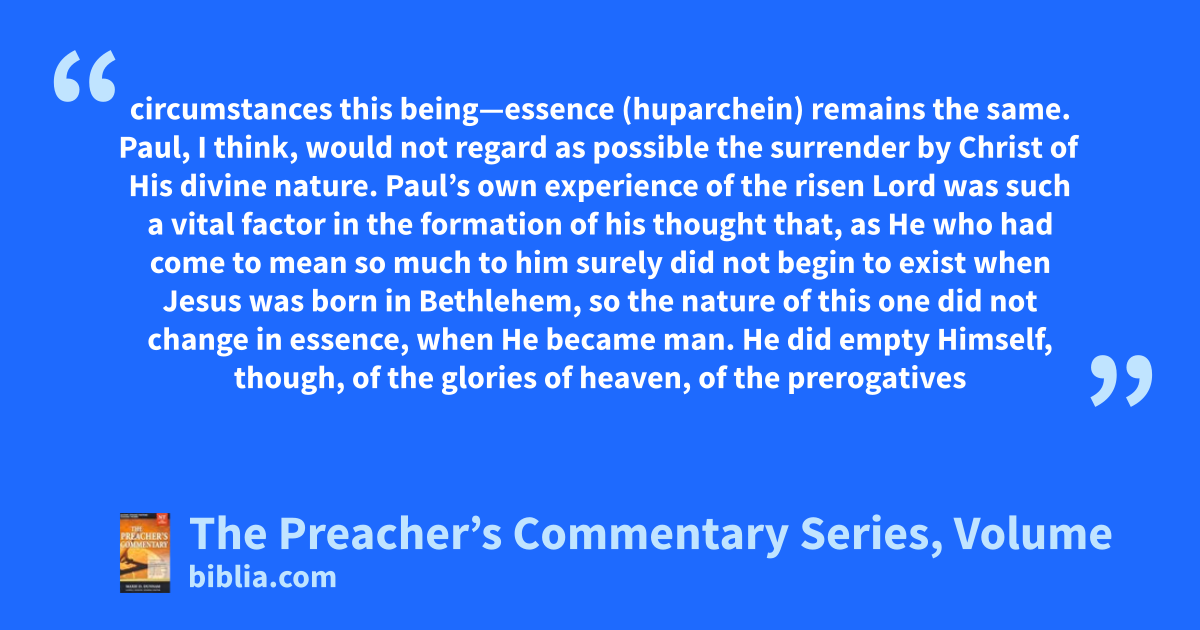 circumstances this being—essence (huparchein) remains the same. Paul, I think, would not regard as possible the surrender by Christ of His divine nature. Paul’s own experience of the risen Lord was such a vital factor in the formation of his thought that, as He who had come to mean so much to him surely did not begin to exist when Jesus was born in Bethlehem, so the nature of this one did not change in essence, when He became man. He did empty Himself, though, of the glories of heaven, of the prerogatives