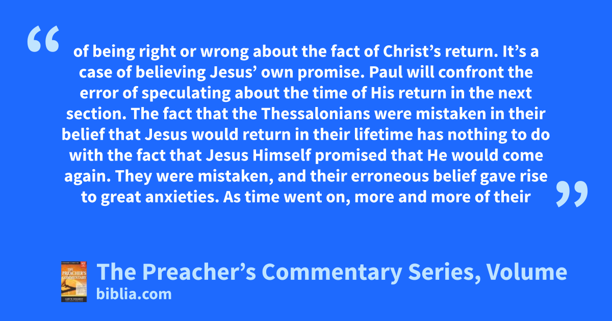 of being right or wrong about the fact of Christ’s return. It’s a case of believing Jesus’ own promise. Paul will confront the error of speculating about the time of His return in the next section. The fact that the Thessalonians were mistaken in their belief that Jesus would return in their lifetime has nothing to do with the fact that Jesus Himself promised that He would come again. They were mistaken, and their erroneous belief gave rise to great anxieties. As time went on, more and more of their