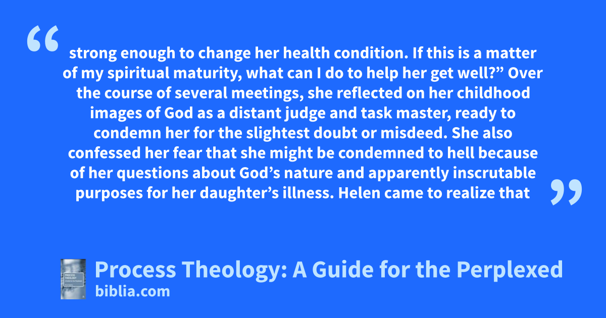 strong enough to change her health condition. If this is a matter of my spiritual maturity, what can I do to help her get well?” Over the course of several meetings, she reflected on her childhood images of God as a distant judge and task master, ready to condemn her for the slightest doubt or misdeed. She also confessed her fear that she might be condemned to hell because of her questions about God’s nature and apparently inscrutable purposes for her daughter’s illness. Helen came to realize that
