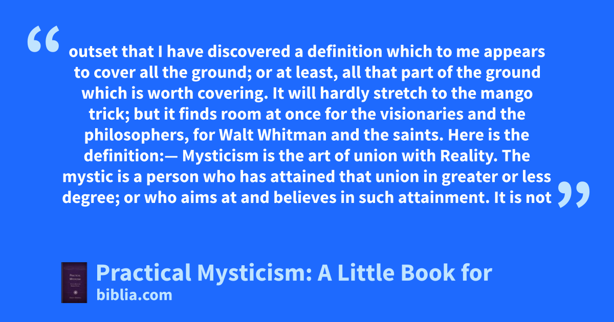 outset that I have discovered a definition which to me appears to cover all the ground; or at least, all that part of the ground which is worth covering. It will hardly stretch to the mango trick; but it finds room at once for the visionaries and the philosophers, for Walt Whitman and the saints. Here is the definition:— Mysticism is the art of union with Reality. The mystic is a person who has attained that union in greater or less degree; or who aims at and believes in such attainment. It is not