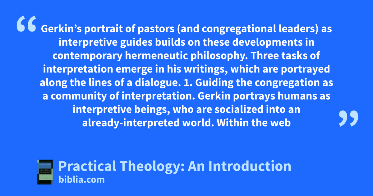 Gerkin’s portrait of pastors (and congregational leaders) as interpretive guides builds on these developments in contemporary hermeneutic philosophy. Three tasks of interpretation emerge in his writings, which are portrayed along the lines of a dialogue. 1. Guiding the congregation as a community of interpretation. Gerkin portrays humans as interpretive beings, who are socialized into an already-interpreted world. Within the web