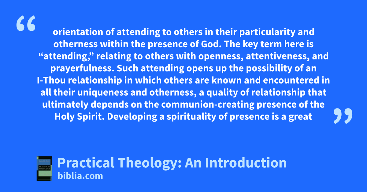 orientation of attending to others in their particularity and otherness within the presence of God. The key term here is “attending,” relating to others with openness, attentiveness, and prayerfulness. Such attending opens up the possibility of an I-Thou relationship in which others are known and encountered in all their uniqueness and otherness, a quality of relationship that ultimately depends on the communion-creating presence of the Holy Spirit. Developing a spirituality of presence is a great