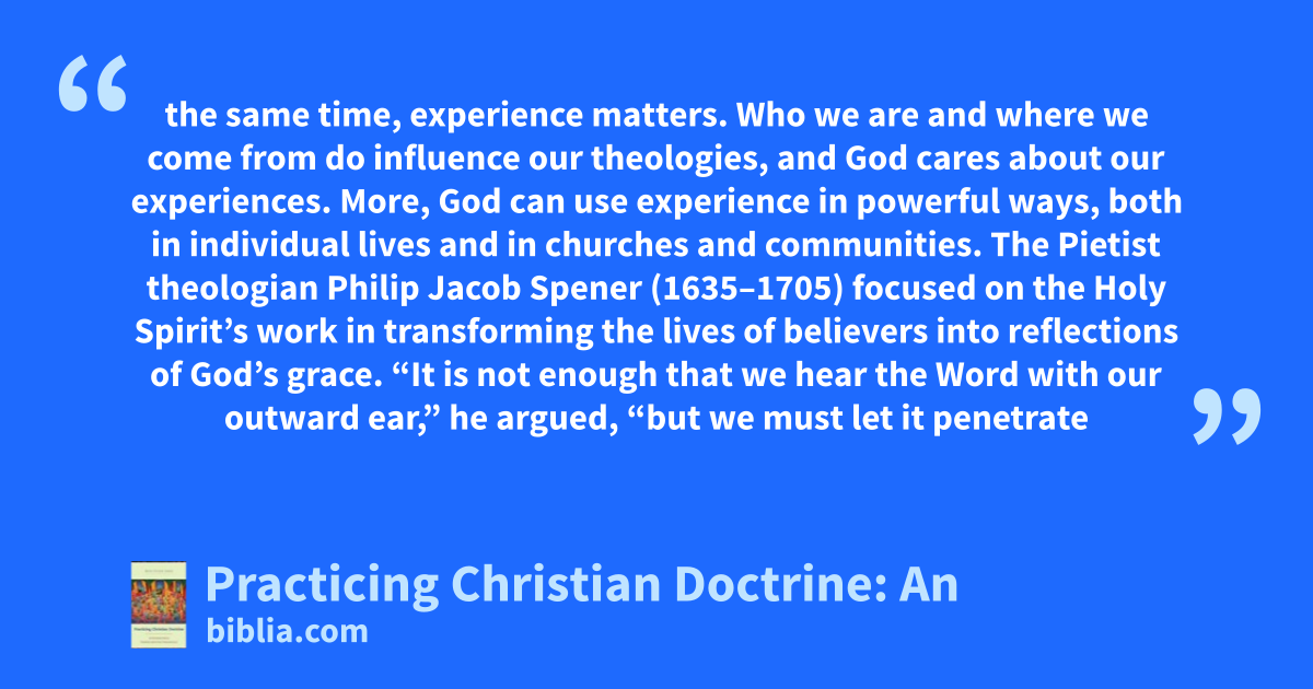 the same time, experience matters. Who we are and where we come from do influence our theologies, and God cares about our experiences. More, God can use experience in powerful ways, both in individual lives and in churches and communities. The Pietist theologian Philip Jacob Spener (1635–1705) focused on the Holy Spirit’s work in transforming the lives of believers into reflections of God’s grace. “It is not enough that we hear the Word with our outward ear,” he argued, “but we must let it penetrate