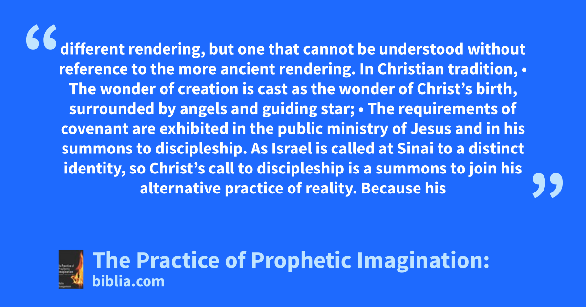 different rendering, but one that cannot be understood without reference to the more ancient rendering. In Christian tradition, • The wonder of creation is cast as the wonder of Christ’s birth, surrounded by angels and guiding star; • The requirements of covenant are exhibited in the public ministry of Jesus and in his summons to discipleship. As Israel is called at Sinai to a distinct identity, so Christ’s call to discipleship is a summons to join his alternative practice of reality. Because his