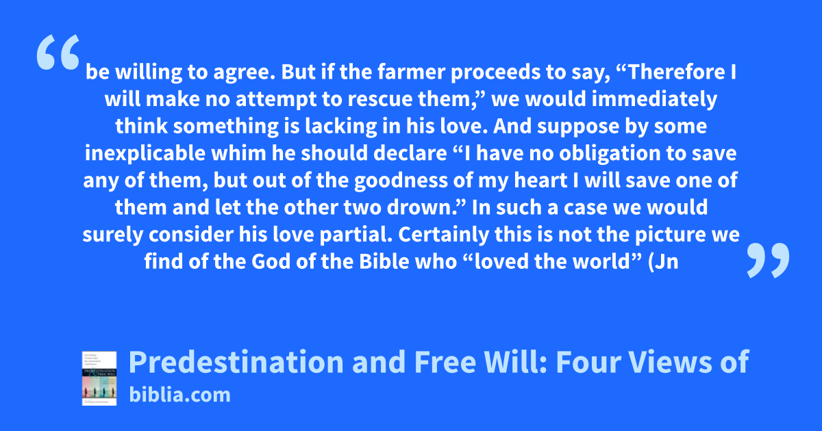 be willing to agree. But if the farmer proceeds to say, “Therefore I will make no attempt to rescue them,” we would immediately think something is lacking in his love. And suppose by some inexplicable whim he should declare “I have no obligation to save any of them, but out of the goodness of my heart I will save one of them and let the other two drown.” In such a case we would surely consider his love partial. Certainly this is not the picture we find of the God of the Bible who “loved the world” (Jn