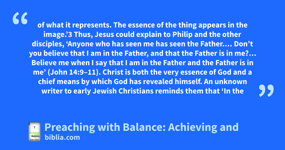 of what it represents. The essence of the thing appears in the image.’3 Thus, Jesus could explain to Philip and the other disciples, ‘Anyone who has seen me has seen the Father.… Don’t you believe that I am in the Father, and that the Father is in me?… Believe me when I say that I am in the Father and the Father is in me’ (John 14:9–11). Christ is both the very essence of God and a chief means by which God has revealed himself. An unknown writer to early Jewish Christians reminds them that ‘In the