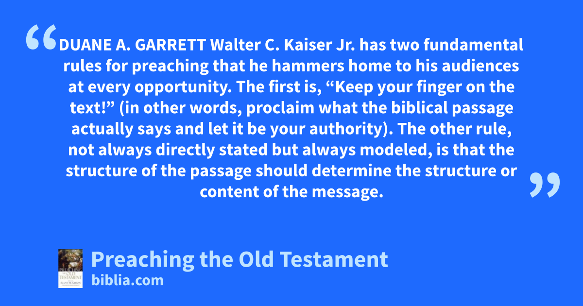 DUANE A. GARRETT Walter C. Kaiser Jr. has two fundamental rules for preaching that he hammers home to his audiences at every opportunity. The first is, “Keep your finger on the text!” (in other words, proclaim what the biblical passage actually says and let it be your authority). The other rule, not always directly stated but always modeled, is that the structure of the passage should determine the structure or content of the message.