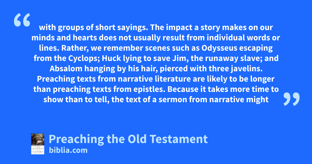 with groups of short sayings. The impact a story makes on our minds and hearts does not usually result from individual words or lines. Rather, we remember scenes such as Odysseus escaping from the Cyclops; Huck lying to save Jim, the runaway slave; and Absalom hanging by his hair, pierced with three javelins. Preaching texts from narrative literature are likely to be longer than preaching texts from epistles. Because it takes more time to show than to tell, the text of a sermon from narrative might