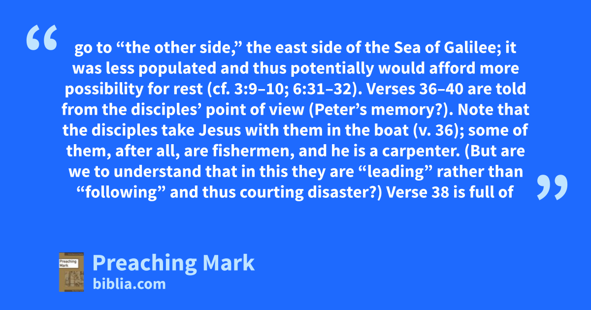 go to “the other side,” the east side of the Sea of Galilee; it was less populated and thus potentially would afford more possibility for rest (cf. 3:9–10; 6:31–32). Verses 36–40 are told from the disciples’ point of view (Peter’s memory?). Note that the disciples take Jesus with them in the boat (v. 36); some of them, after all, are fishermen, and he is a carpenter. (But are we to understand that in this they are “leading” rather than “following” and thus courting disaster?) Verse 38 is full of