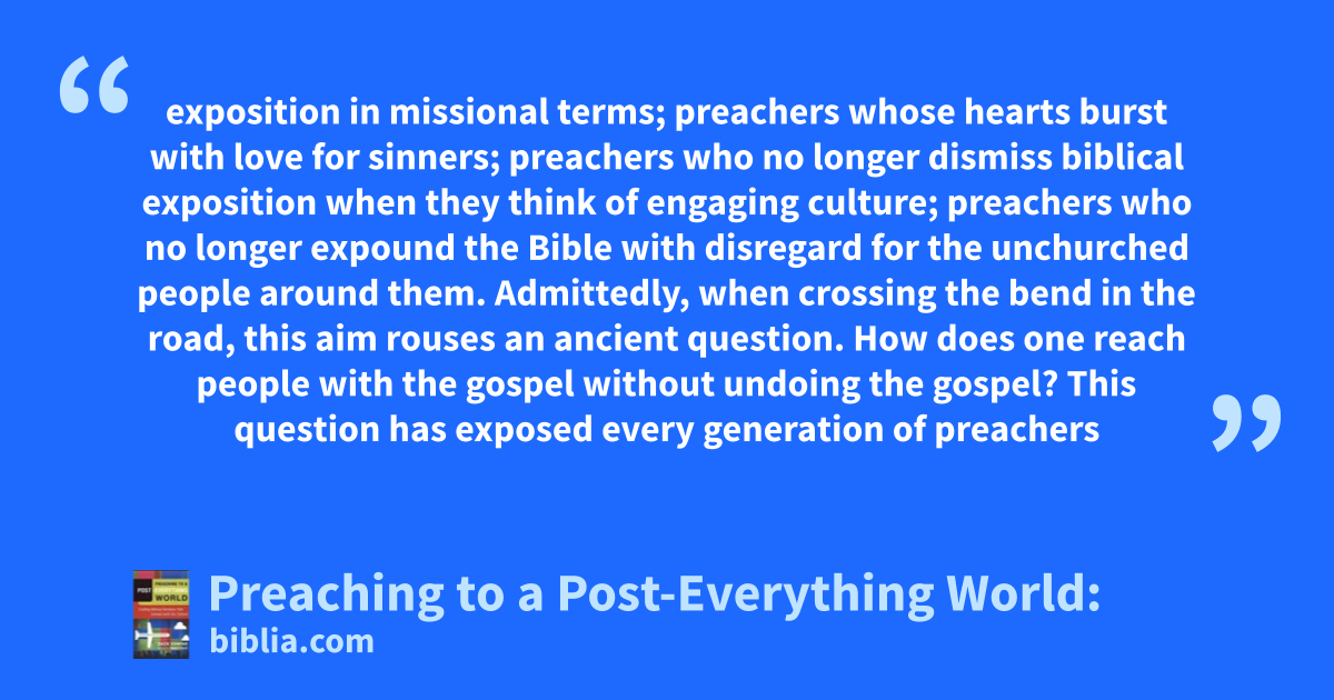 exposition in missional terms; preachers whose hearts burst with love for sinners; preachers who no longer dismiss biblical exposition when they think of engaging culture; preachers who no longer expound the Bible with disregard for the unchurched people around them. Admittedly, when crossing the bend in the road, this aim rouses an ancient question. How does one reach people with the gospel without undoing the gospel? This question has exposed every generation of preachers