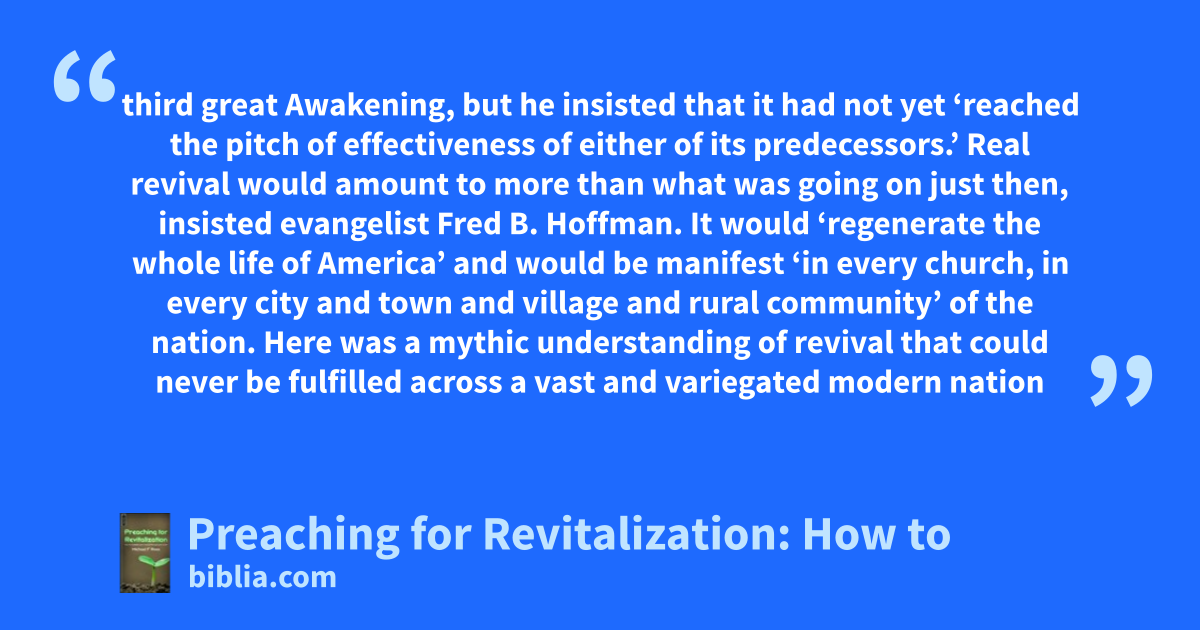 third great Awakening, but he insisted that it had not yet ‘reached the pitch of effectiveness of either of its predecessors.’ Real revival would amount to more than what was going on just then, insisted evangelist Fred B. Hoffman. It would ‘regenerate the whole life of America’ and would be manifest ‘in every church, in every city and town and village and rural community’ of the nation. Here was a mythic understanding of revival that could never be fulfilled across a vast and variegated modern nation