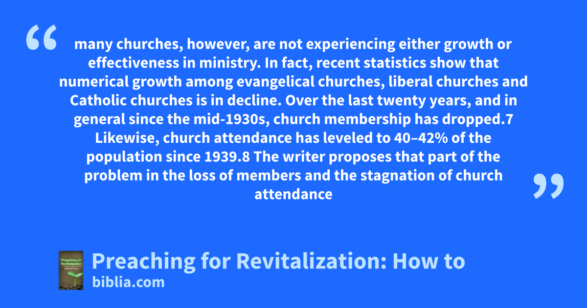 many churches, however, are not experiencing either growth or effectiveness in ministry. In fact, recent statistics show that numerical growth among evangelical churches, liberal churches and Catholic churches is in decline. Over the last twenty years, and in general since the mid-1930s, church membership has dropped.7 Likewise, church attendance has leveled to 40–42% of the population since 1939.8 The writer proposes that part of the problem in the loss of members and the stagnation of church attendance