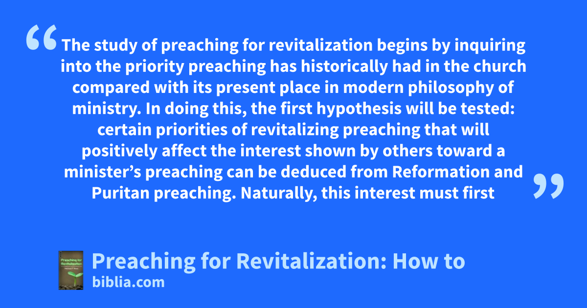 The study of preaching for revitalization begins by inquiring into the priority preaching has historically had in the church compared with its present place in modern philosophy of ministry. In doing this, the first hypothesis will be tested: certain priorities of revitalizing preaching that will positively affect the interest shown by others toward a minister’s preaching can be deduced from Reformation and Puritan preaching. Naturally, this interest must first